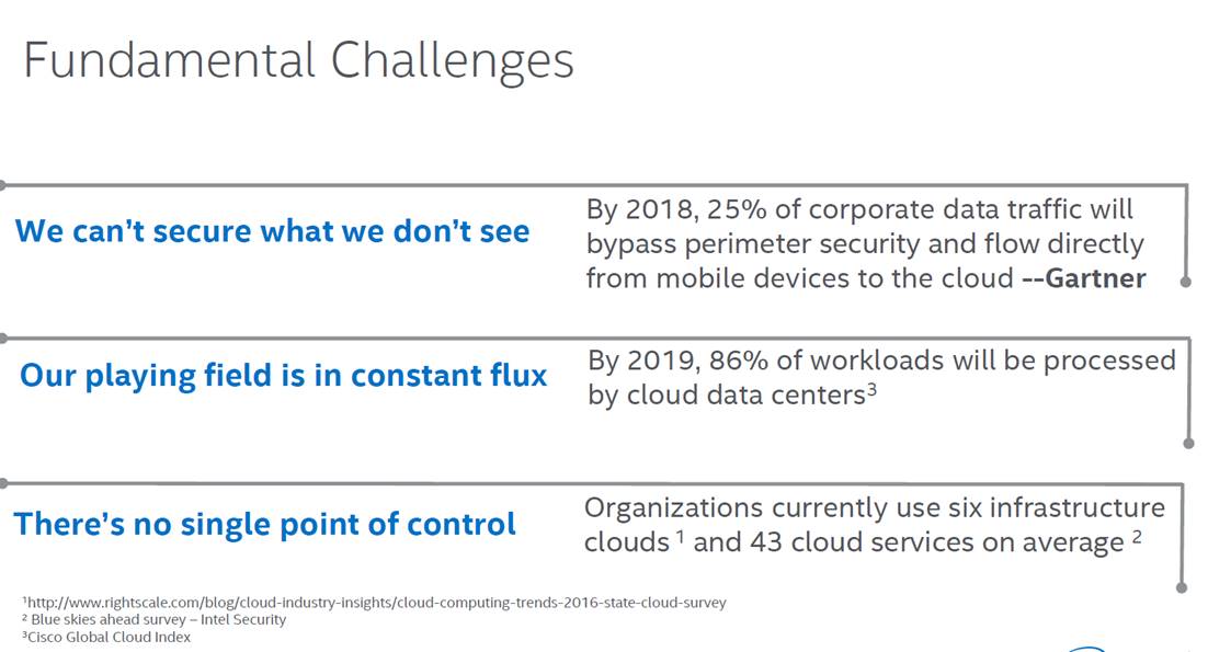Le DSI et ses équipes doivent pouvoir visualiser aisément ce qui est dans le cloud et ce qui ne l’est pas, ainsi que tous les flux d’information sortant du SI interne vers le cloud. L’objectif est de rendre le SI agile sur les différentes fonctions de sécurité, telles que la protection anti malware, la surveillance de trafic et la prévention de la fuite de données ou DLP (Data Loss Prevention). C’est en particulier l’approche commune défendue par Intel Security et l’initiative Orange Cyberdefense.