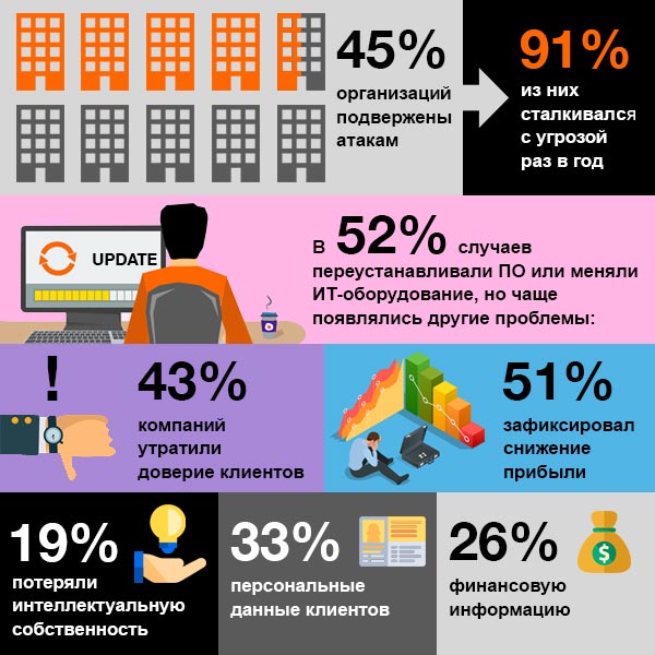 Опрос 270 компаний в Канаде и США показал, что статистика неутешительная: из 45% атакованных организаций 91% сталкивался с угрозой раз в год, и в 52% случаев переустанавливали ПО или меняли ИТ-оборудование.